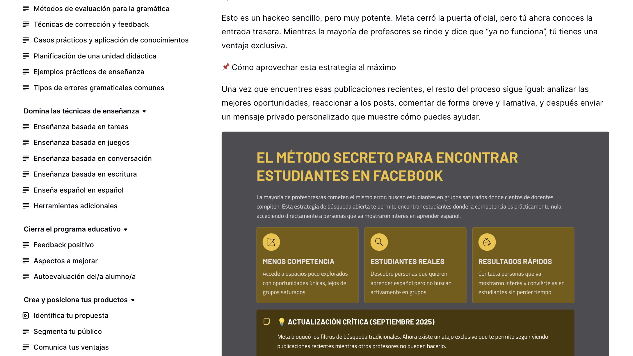Aprende paso a paso a crear, enseñar y escalar tu negocio de español online desde cero. Son 197 lecciones actualizadas cada mes, con estrategias reales, ejemplos concretos y plantillas listas para aplicar. Aquí construyes la base sólida que te permitirá vivir de tu vocación con claridad y resultados.