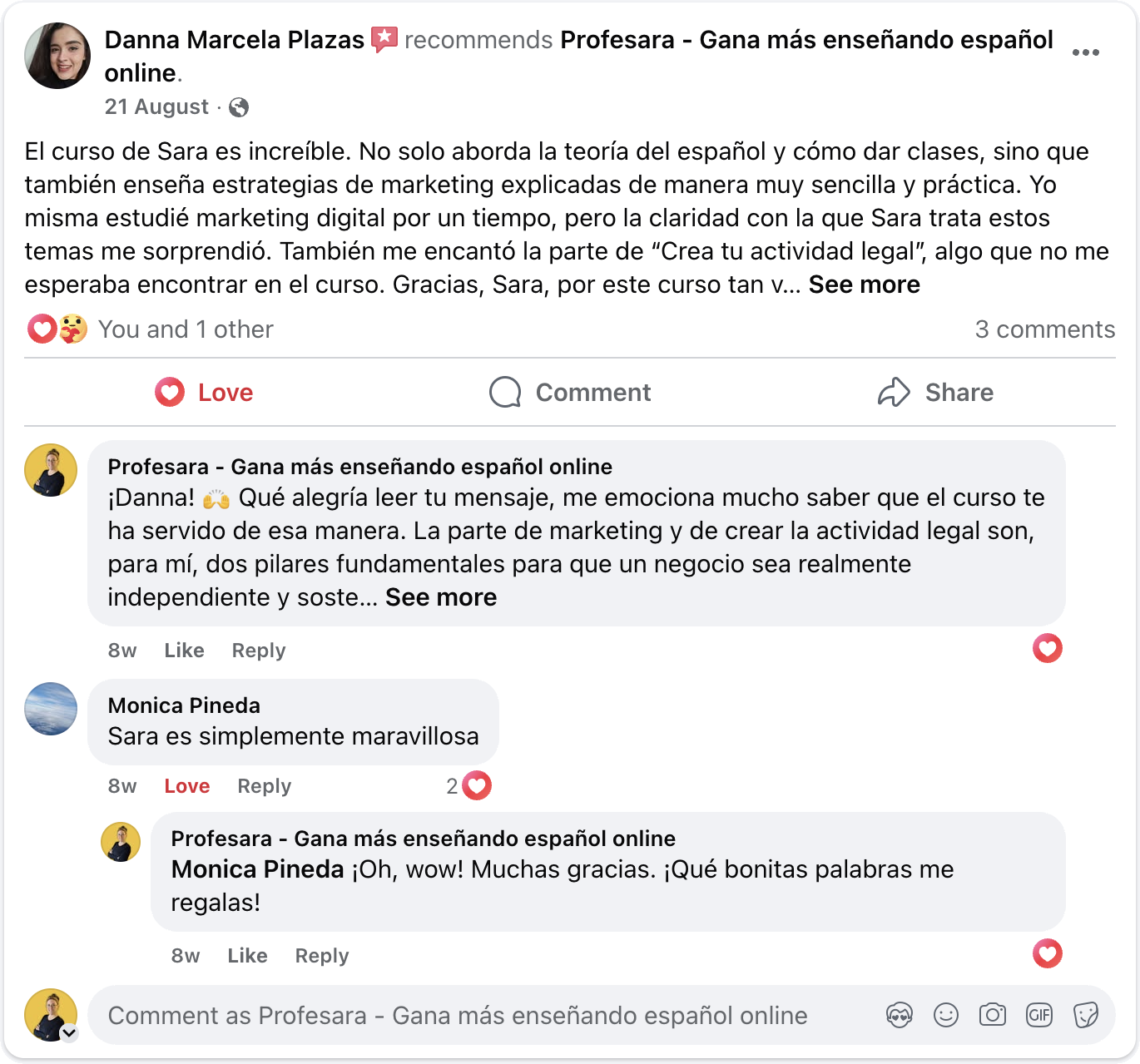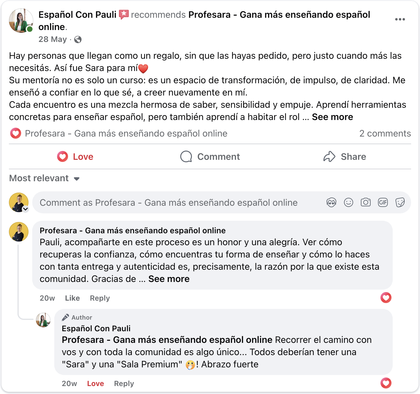 También estuve donde tú estás: amando enseñar, pero sin saber cómo vivir de ello. Pasé por trabajos mal pagados y esa sensación constante de no estar donde debía, hasta que descubrí que enseñar español online podía ser una forma de vida libre y con propósito. Hoy lidero la comunidad más activa de profes de español online y acompaño a miles de personas a construir lo que yo misma busqué durante años. Si lo sientes como yo lo sentí, este es tu momento.